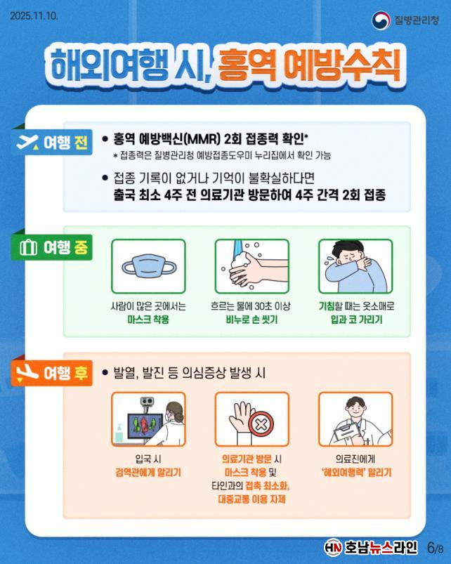 ´Ù¸¸, È«¿ªÀº ¿¹¹æÁ¢Á¾À¸·Î ÃæºÐÈ÷ ¿¹¹æÀÌ °¡´ÉÇÏ´Ù. ÀÌ¿¡ µû¶ó ÇØ¿Ü¿©Çà Àü MMR(È«¿ª¡¤À¯Ç༺ÀÌÇϼ±¿°¡¤Ç³Áø) ¿¹¹æÁ¢Á¾ 2ȸ ¿Ï·á ¿©ºÎ¸¦ È®ÀÎÇϰí, Á¢Á¾ ¿©ºÎ°¡ ºÒÈ®½ÇÇÑ °æ¿ì Ãâ±¹ ÃÖ¼Ò 4ÁÖ Àü ÀÇ·á±â°ü »ó´ãÀ» ÅëÇÑ ¿¹¹æÁ¢Á¾À» ±Ç°íÇÑ´Ù.