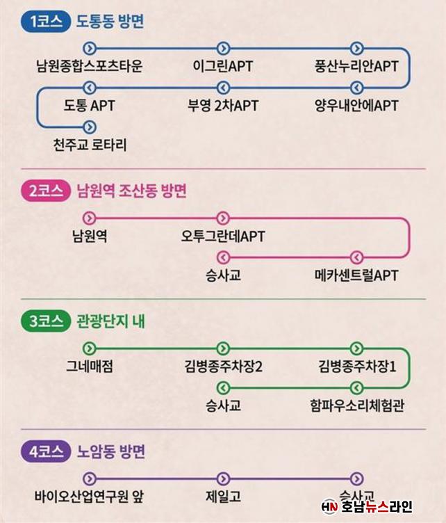 ¹«·á ¼ÅƲ¹ö½º´Â ÃÑ 4°³ ³ë¼±À¸·Î ¿î¿µµÇ¸ç, ±¸Ã¼ÀûÀÎ ±¸°£Àº ¡ã1³ë¼± ³²¿øÁ¾ÇÕ½ºÆ÷Ã÷Ÿ¿î ¡ê õÁÖ±³ ·ÎŸ¸® ¡ã2³ë¼± ³²¿ø¿ª ¡ê ½Â»ç±³ ¡ã3³ë¼± ±×³×¸ÅÁ¡ ¡ê ½Â»ç±³ ¡ã4³ë¼± ³²¿ø¹ÙÀÌ¿À»ê¾÷¿¬±¸¿ø ¡ê ½Â»ç±³ µîÀÌ´Ù. ¿îÇà ½Ã°£Àº ¿ÀÀü 10½ÃºÎÅÍ ¿ÀÈÄ 11½Ã±îÁöÀ̸ç, ¾à 15~30ºÐ °£°ÝÀ¸·Î ¼øÈ¯ ¿îÇàÇÑ´Ù.