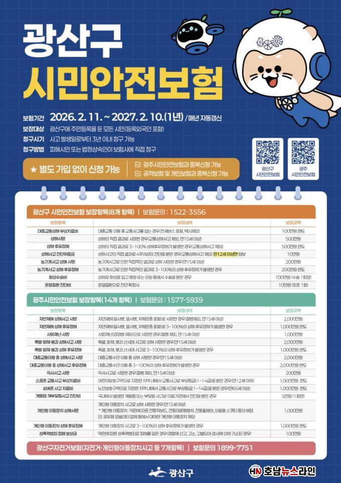 ±¤»ê±¸ ½Ã¹Î¾ÈÀüº¸ÇèÀº µî·Ï ¿Ü±¹ÀÎÀ» Æ÷ÇÔÇØ ±¤»ê±¸¿¡ Áֹεî·ÏÀ» µÐ ¸ðµç ½Ã¹ÎÀÌ º°µµÀÇ °¡ÀÔ ÀýÂ÷ ¾øÀÌ ÀÚµ¿ °¡ÀԵȴÙ. º¸Çè·á´Â Àü¾× ±¤»ê±¸°¡ ºÎ´ãÇÑ´Ù. ½Ç»ýȰ¿¡¼ ´©±¸³ª °ÞÀ» ¼ö ÀÖ´Â ´Ù¾çÇÑ ÇÇÇØ¸¦ º¸ÀåÇϰí, °³Àκ¸Çè°ú Áߺ¹À¸·Î ½Åûµµ °¡´ÉÇÏ´Ù.