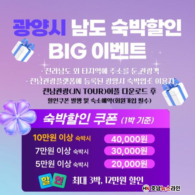 ¡®³²µµ ¼÷¹ÚÇÒÀÎ BIG À̺¥Æ®¡¯´Â Àü³²¡¤±¤ÁÖ ¿Ü Áö¿ª °ü±¤°´À» ´ë»óÀ¸·Î Àü³²Áö¿ª ¼÷¹Ú¾÷¼Ò ÀÌ¿ë ½Ã ÇÒÀÎ ÇýÅÃÀ» Á¦°øÇÏ´Â »ç¾÷ÀÌ´Ù. ÀÌ¿ëÀ» ¿øÇÏ´Â °ü±¤°´Àº Àü³²°ü±¤Ç÷§Æû(JN TOUR)¿¡ ȸ¿ø °¡ÀÔ ÈÄ ¡®±¤¾ç½Ã¡¯¸¦ ¼±ÅÃÇØ ÇÒÀÎ ÄíÆùÀ» ¹ß±Þ¹Þ¾Æ »ç¿ëÇÏ¸é µÈ´Ù.