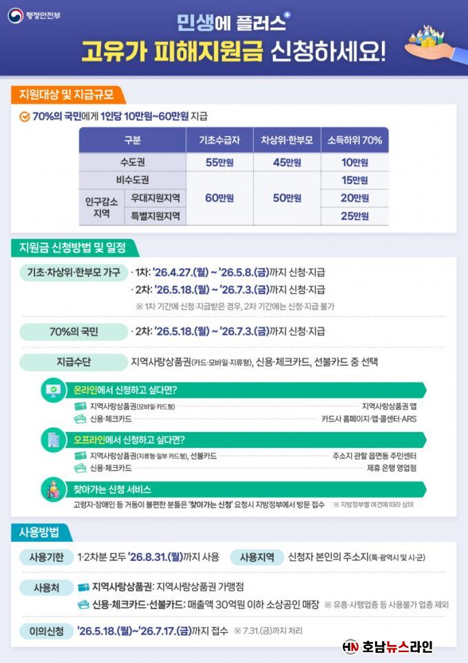 1Â÷´Â 4¿ù 27ÀϺÎÅÍ 5¿ù 8ÀϱîÁö·Î ±âÃÊ»ýȰ¼ö±ÞÀÚ, Â÷»óÀ§, ÇѺθ𠰡Á·À» ¿ì¼± Áö±ÞÇϸç, 2Â÷´Â 5¿ù 18ÀϺÎÅÍ 7¿ù 3ÀϱîÁö 1Â÷ ´ë»óÀÚ¸¦ Á¦¿ÜÇÑ ¼Òµæ ÇÏÀ§ 70%¿Í 1Â÷ ´ë»óÀÚ Áß ½ÅûÀ» ÇÏÁö ¸øÇÑ ±º¹Î¿¡°Ô Áö¿ø±ÝÀ» Áö±ÞÇÑ´Ù.